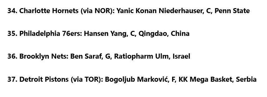 06月 24 2025 0 美媒NBC最新一期模拟选秀排名:中国球员杨瀚森第35顺位被76人选中 xiaoqiao 2025-06-24 nba 128 雷速体育6月17日讯 美媒NBC更新2025年NBA模拟选秀最新一期排名,中国球员杨瀚森第35顺位被76人队选中。据此前报道,杨瀚森已试训10支NBA球队,这一数据创中国球员的试训纪录新高,同时杨瀚森的NBA试训之旅已经接近尾声。
