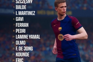 巴萨首发:25-什琴斯尼、23-孔德、24-加西亚、5-伊尼戈、3-巴尔德、8-佩德里、21-德容、6-加维、19-亚马尔、7-费兰、20-奥尔莫